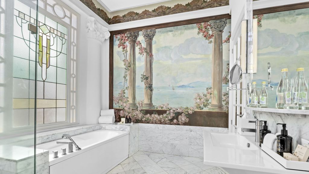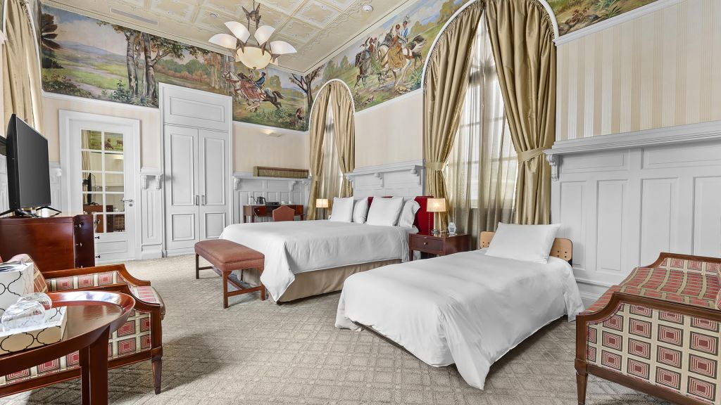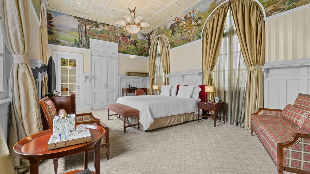 1 king bed – 48sqm / 517sqft – sitting area – the junior suite overlooks the garden and the panecillo hillside – this room used to be the “tea room” of the gangotena family, where the family’s women and friends would gather – situated on the first floor, the spacious junior suite features an original, 360-degree restored mural depicting a hunting scene – desk – table and armchair – en-suite bathroom with bath and shower combination – double vanity – makeup mirror – hairdryer – bathrobes and slippers – l’ occitane bathroom amenities – complimentary wi-fi – 32’ flat screen tv with cable and over 90 national and international channels – telephone – air conditioning and heating – tea / coffee maker – in room safe – connecting rooms possible – extra single bed possible for a child up to 15 years – charges apply – maximum occupancy 2 adults and 1 child up to 15 years old