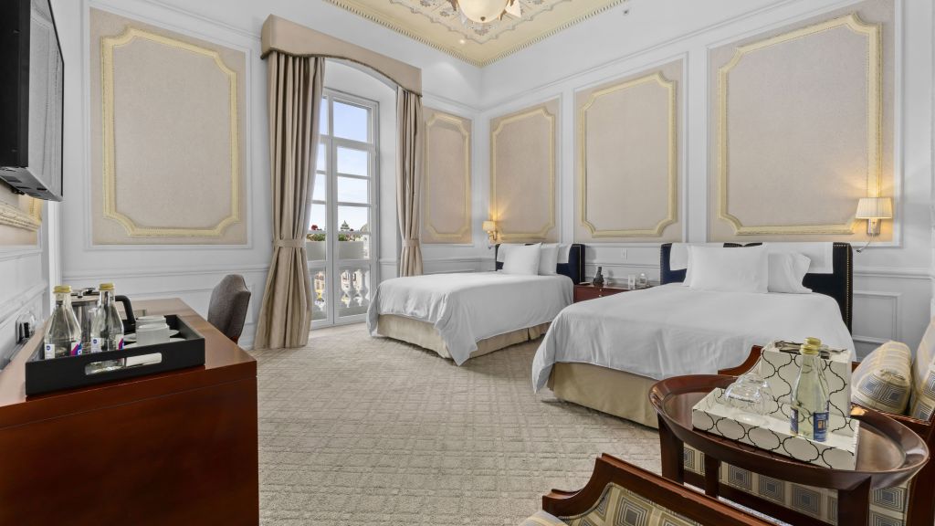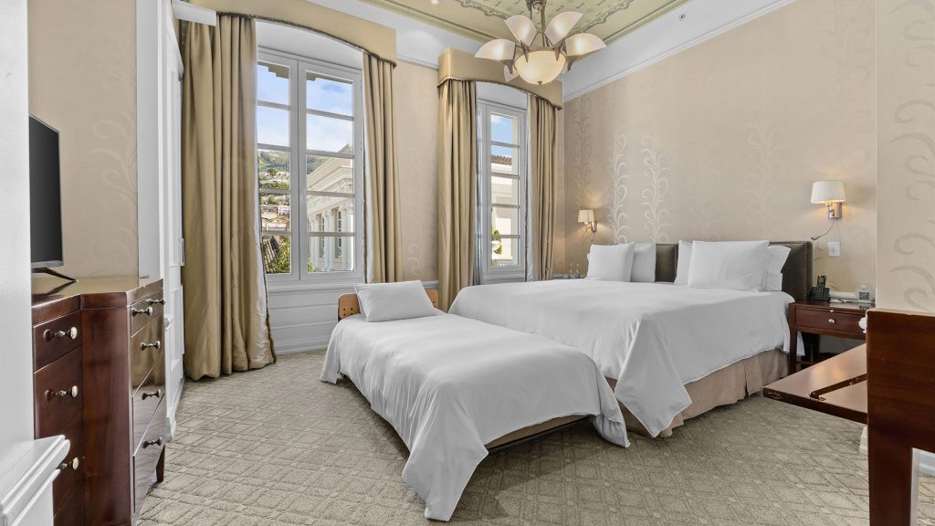 2 full size double beds – 32sqm / 344sqft – sitting area – located along the mansion’s northern façade – these rooms afford stunning views of the historic center – plaza views including the church and convent of san francisco and its expansive cobbled square – the rooms are graced with ample amounts of natural light and rich, sophisticated décor – desk – table and armchair – en-suite bathroom with bath and shower combination – double vanity – makeup mirror – hairdryer – bathrobes and slippers – l’occitane bathroom amenities – complimentary wi-fi – 32’ flat screen tv with cable and over 90 national and international channels – telephone – air conditioning and heating – tea / coffee maker – in room safe – connecting rooms possible – extra single bed possible for a child up to 15 years – charges apply – maximum occupancy 2 adults and 2 children up to 15 years old
