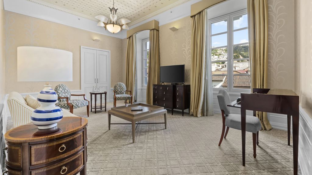 1 king bed – 29sqm / 317sqft – sitting area – the room has its own balcony that overlooks the garden and offers picturesque views of the virgin of quito atop her hill – located on the first floor, at the end of the southwestern wing of the property, the balcony junior suite is undeniably romantic – neoclassical stucco columns adorn the room. The delightful bathroom features two large windows that draw in the andean light, while beautiful columns and black-and-white veined marble complete the picture – desk – table and armchair – en-suite bathroom with bath and shower combination – double vanity – makeup mirror – hairdryer – bathrobes and slippers – l’ occitane bathroom amenities – complimentary wi-fi – 32’ flat screen tv with cable and over 90 national and international channels – telephone – air conditioning and heating – tea / coffee maker – in room safe – connecting rooms possible – no extra bed possible – maximum occupancy 2 adults