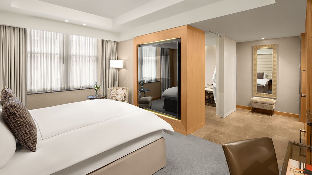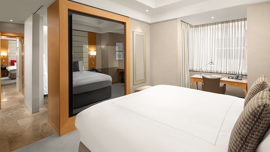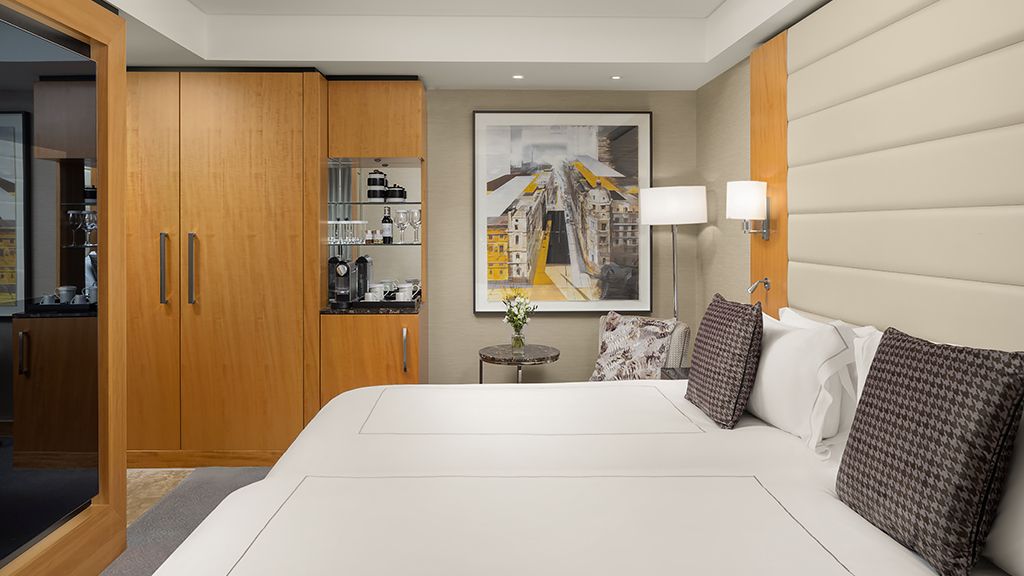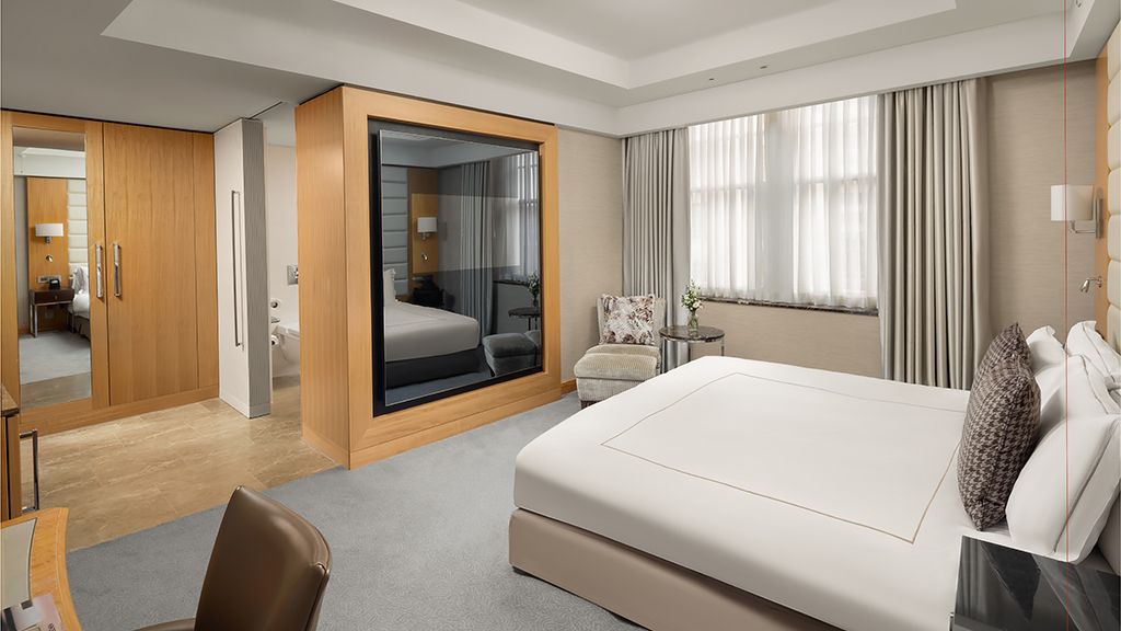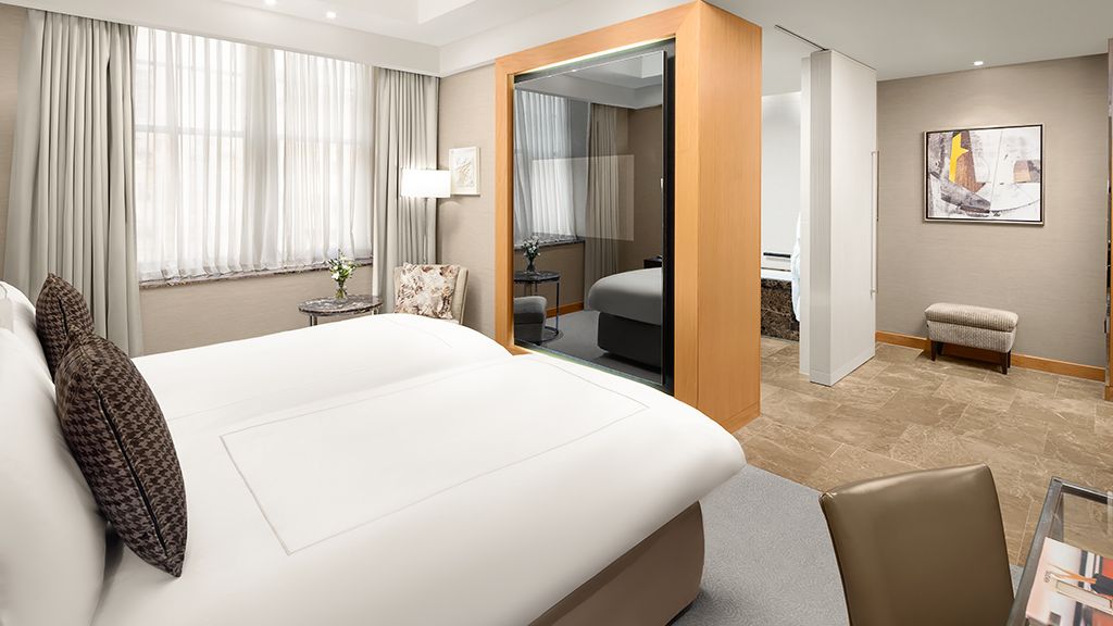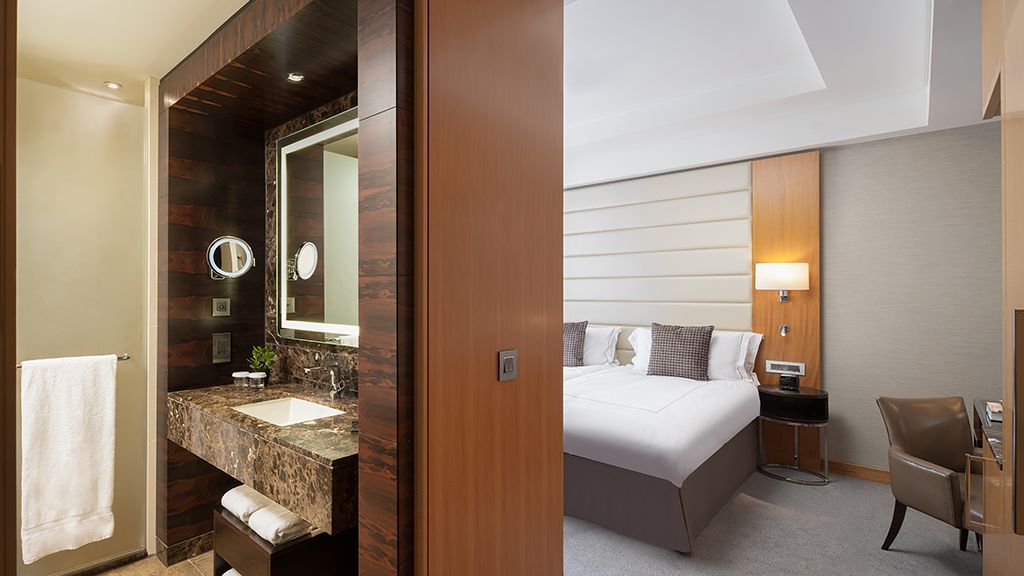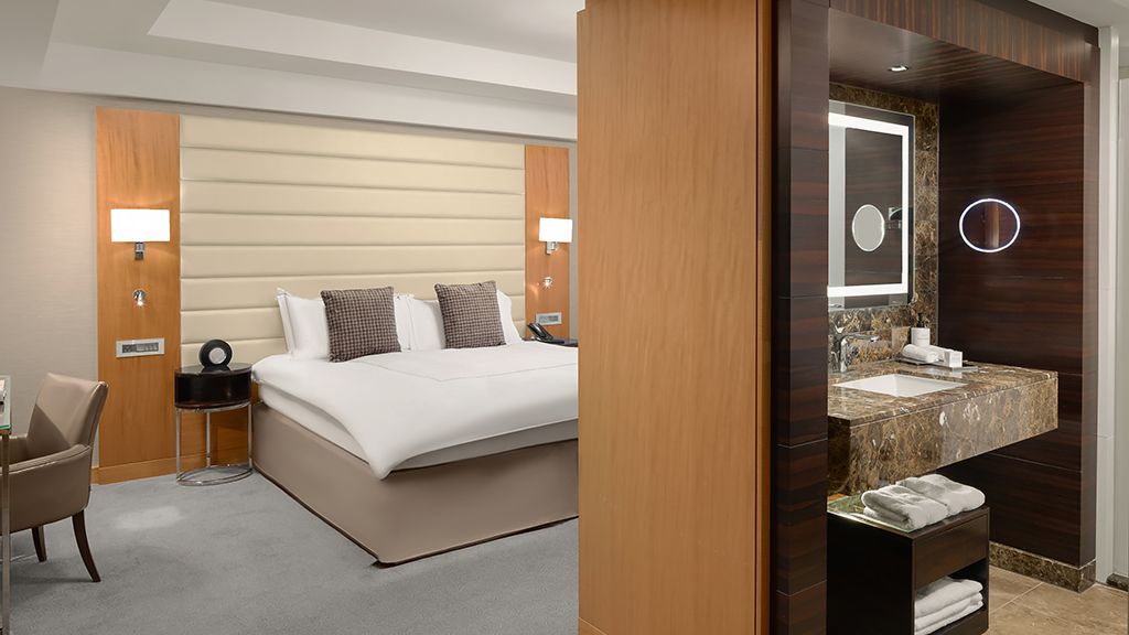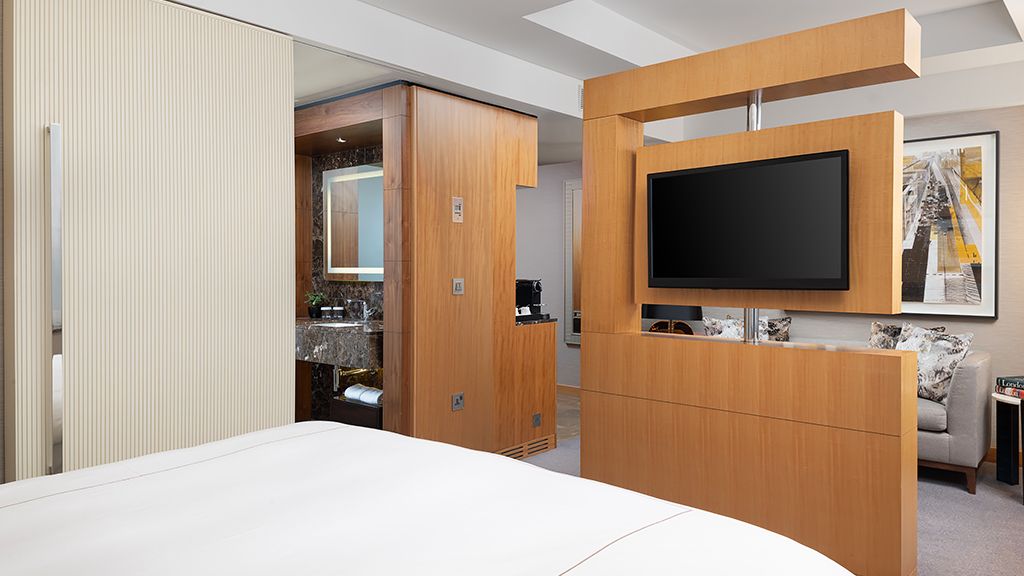 Features a King bed, complimentary Wi-Fi, living room with dining area, spacious bathroom. Includes lounge access with breakfast, drinks and snacks. Maximum occupancy is 3 adults.