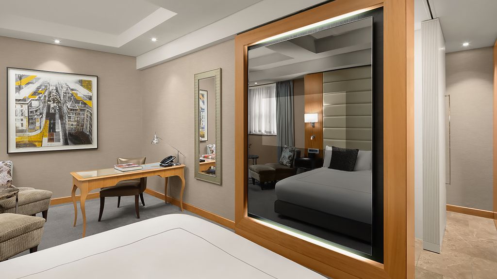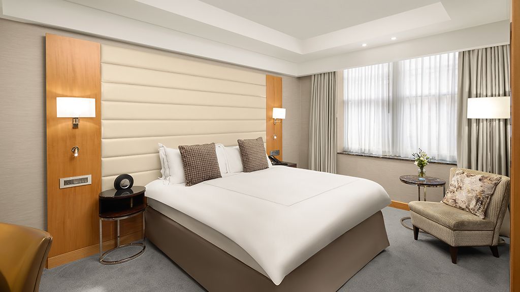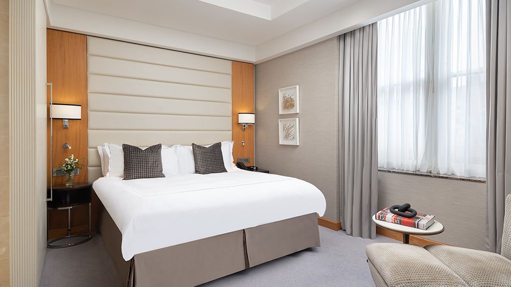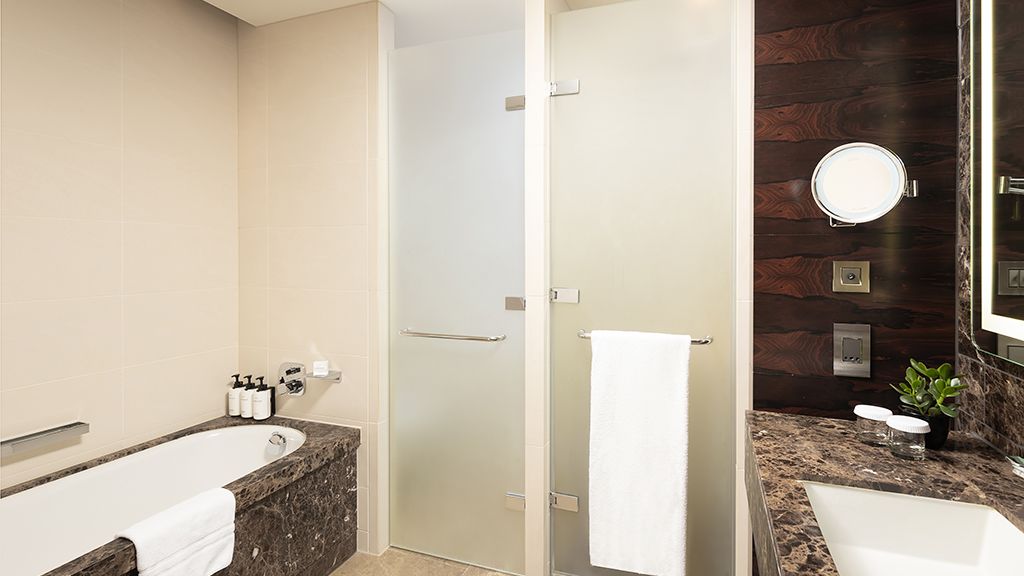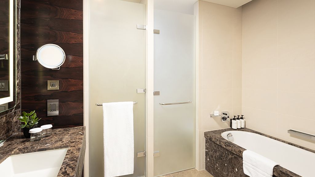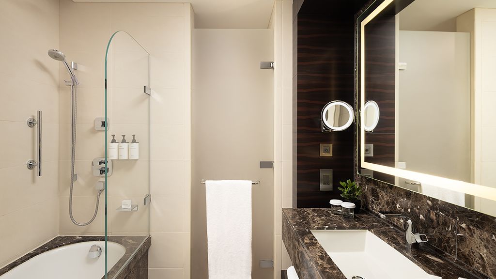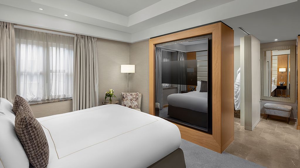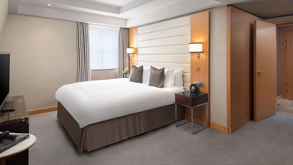 Features a King bed, complimentary Wi-Fi, living room with dining area, spacious bathroom. Includes lounge access with breakfast, drinks and snacks. Maximum occupancy is 3 adults.