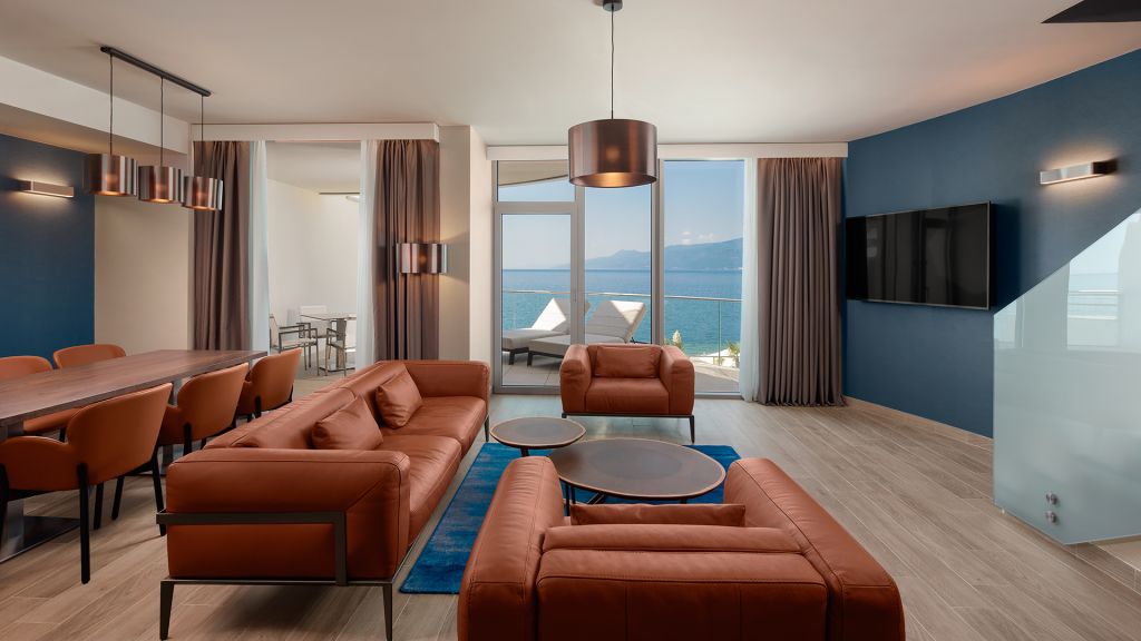 Villa with living room, mini fridge, balcony, two bedrooms, two bathrooms, three TVs and coffee/tea.
