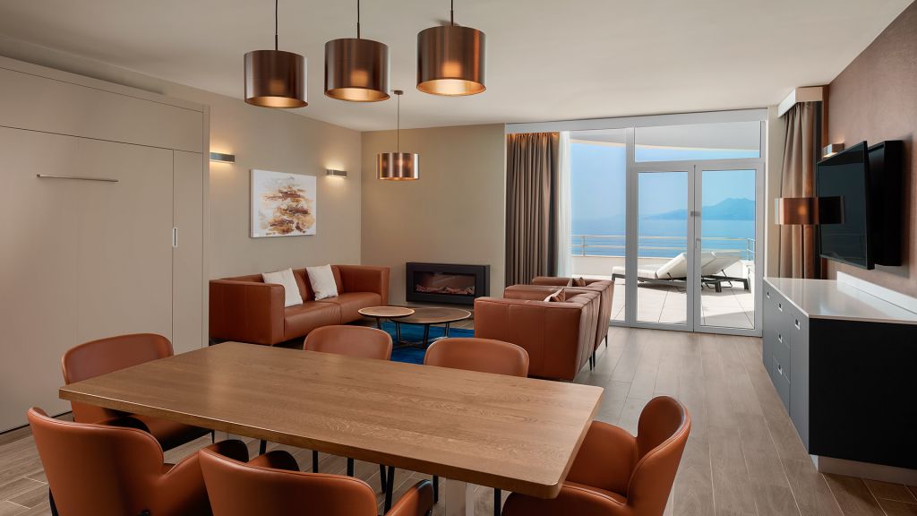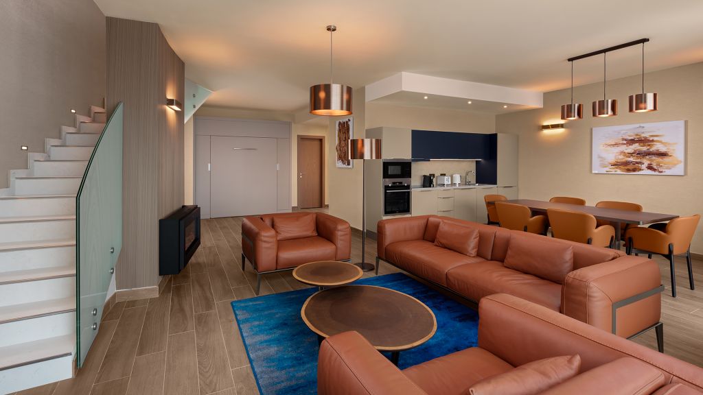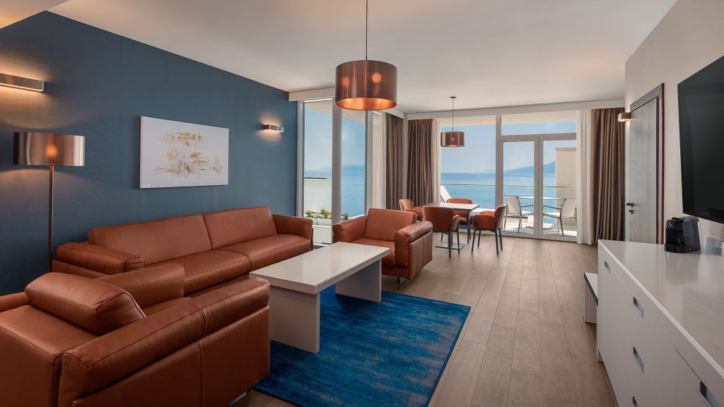Panorama Suite with complimentary Wi-Fi, living room with sofa, coffee/tea, two TVs and balcony.