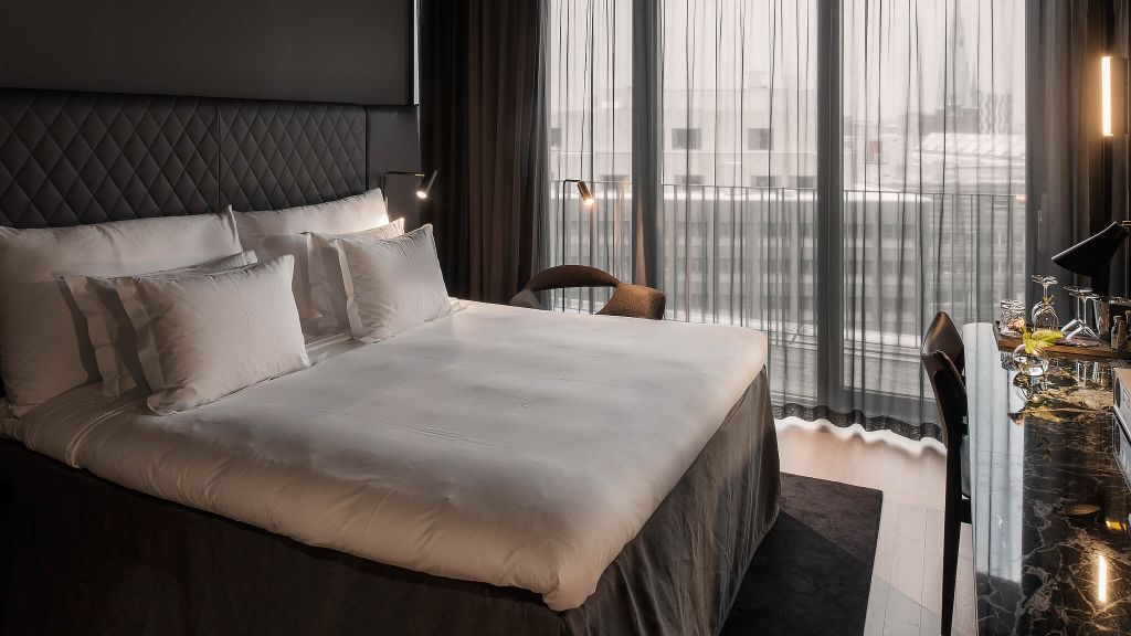 Spacious and exclusive rooms by Universal Design Studio featuring a super comfortable bed from high quality Swedish manufacturer Anders Hilding (sporting organic cotton and several different pillows to suit every taste), a work desk, a luxurious bathroom and a lounge seating with a bar corner in a bay window setting. View over Brunkebergstorg.