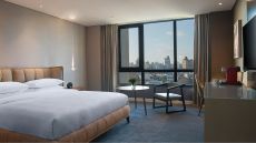 Admire the exciting city views through the floor-to-ceiling windows in this sophisticated room with designer details, a king bed, desk, and a modern bathroom with a walk-in shower.