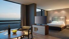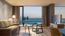 Upgrade to this stunning suite with a furnished balcony for an elevated experience. Enjoy a spacious living room with a sofa and desk, a king bed, and a grand bathroom with a walk-in shower.