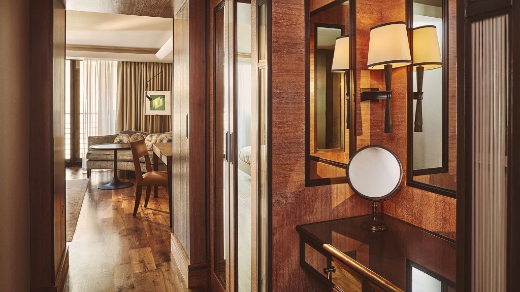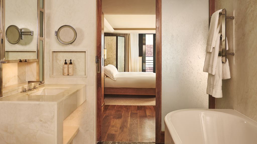 Beautifully contemporary in design, with one or two secrets up its sleeve. The split-level Library Suite is a delight for book-lovers and appreciators of the finer things in life, created by architect Michael Blair. Walking into the Library Suite for the first time is an experience to savour. The large reception hall, with its polished plaster walls and marble floors, hints at what’s to come. Follow the softly side-lit marble steps and emerge into the sitting room of this two-bedroom luxury suite. The walls are lined with art, photography and fashion monographs, while the feature skylight bathes the seating area in light. View the modern artwork and browse the shelves – then open the secret door to the master bedroom. This peaceful space pairs contemporary furnishings, such as an elegant king bed, with classically-inspired features.