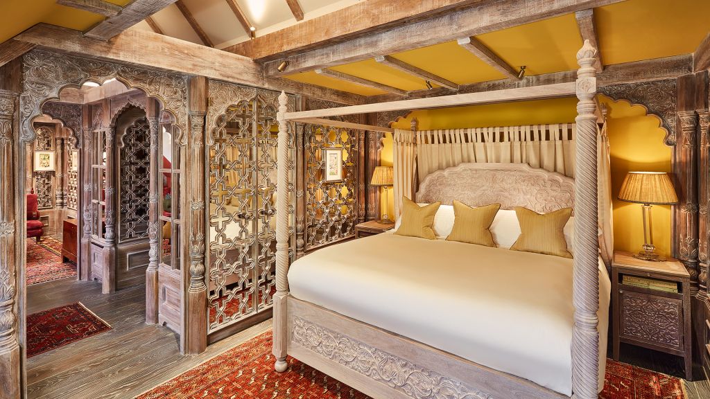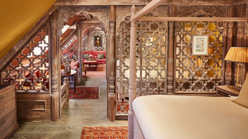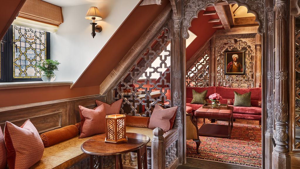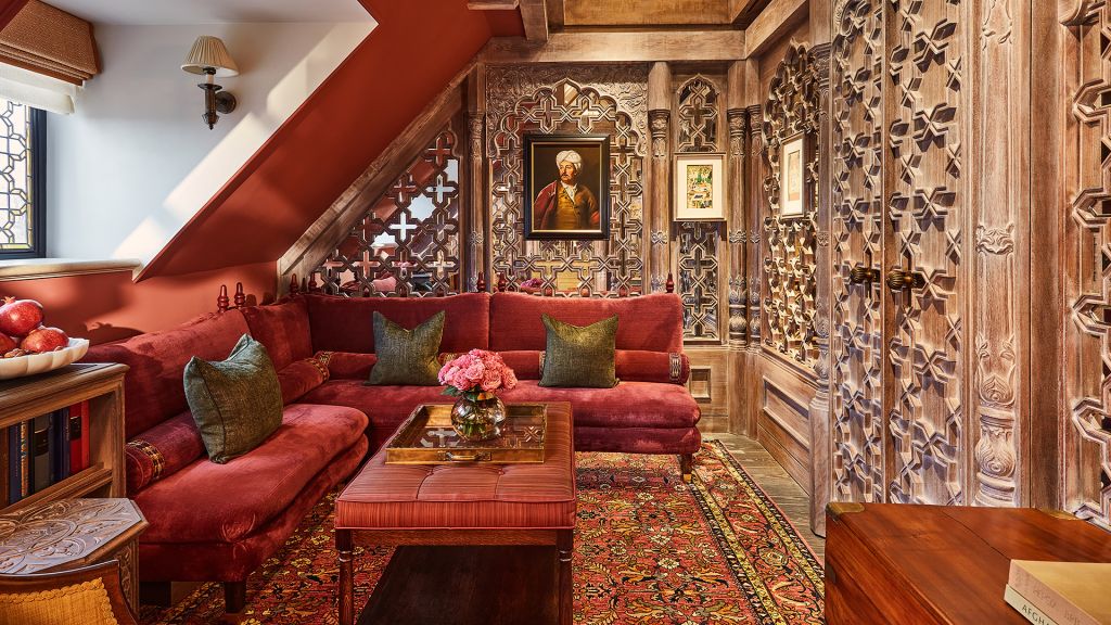 To step into The King’s Lodge is to step into another time – a world away from the bustle of Mayfair. In a rich tapestry of cultures and craft, this is a space dedicated to ancient history and time-honoured practices, where each bespoke element has a story to tell. Against a palette of deep reds, terracotta and gold, intricate details and lavish textiles unfold. Mughal-inspired design sets a majestic tone, with Guy Oliver’s creative vision brought to life by artisans from Jordan to Afghanistan. Stretch out in the dappled light from Helen Whittaker’s stained-glass or soak it all up in the stately marble bathroom, with its exquisitely carved panels.